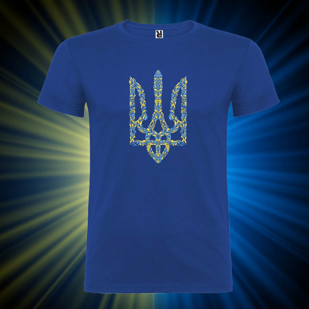 Чоловіча футболка Орнаментальний Тризуб у блакитному та жовтому кольорі. Розмір принта А4. Тканина 100% бавовна, приємна до тіла.