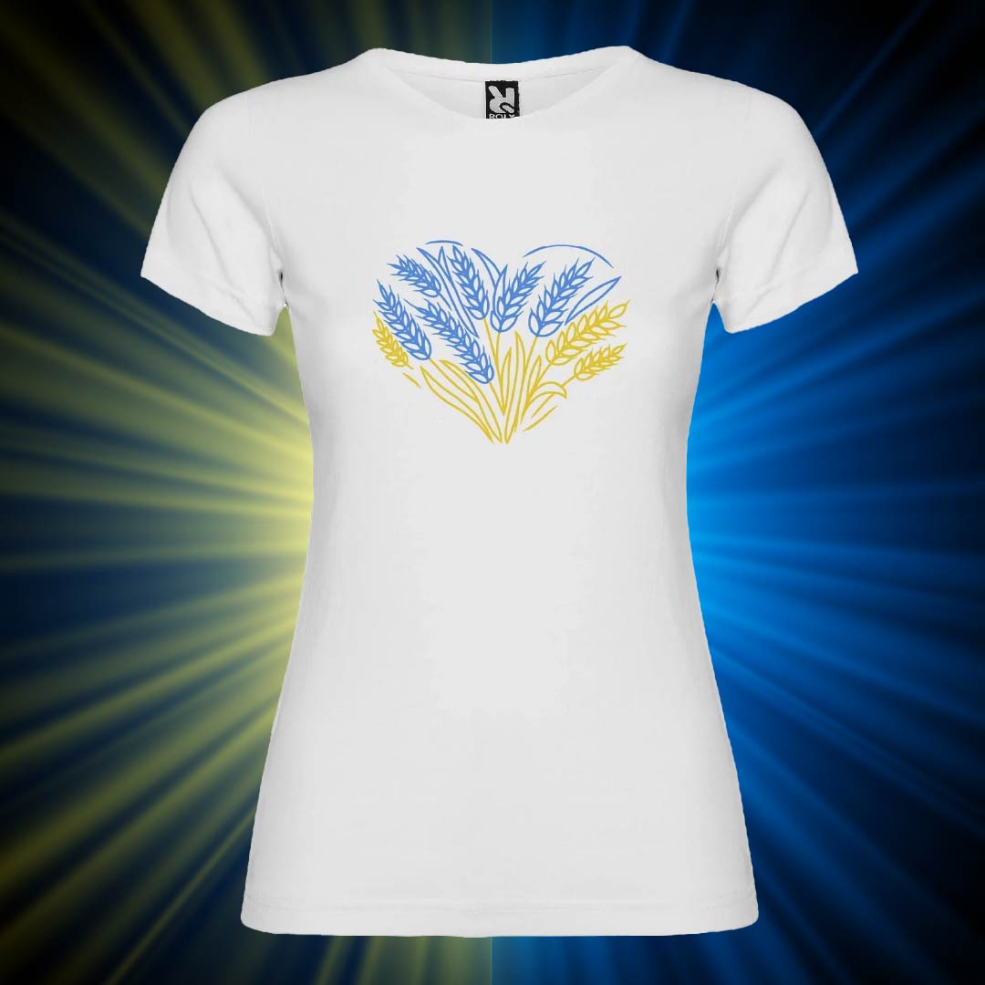 Жіноча футболка патріотична Колоски: українське поле в твоєму серці. Ніжний дизайн з колосками пшениці, виконаний у вигляді серця, нагадує про красу української природи та є символом родючості. М’яка бавовна забезпечує комфорт протягом всього дня.