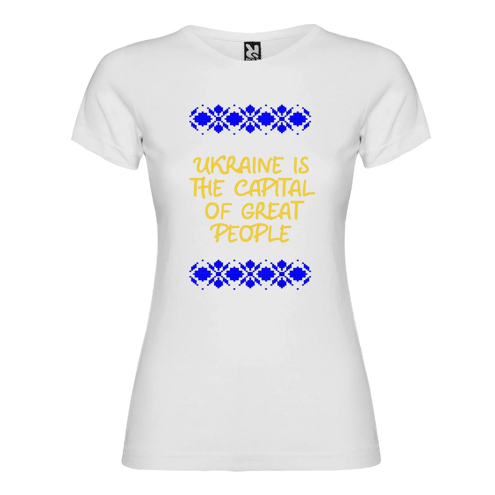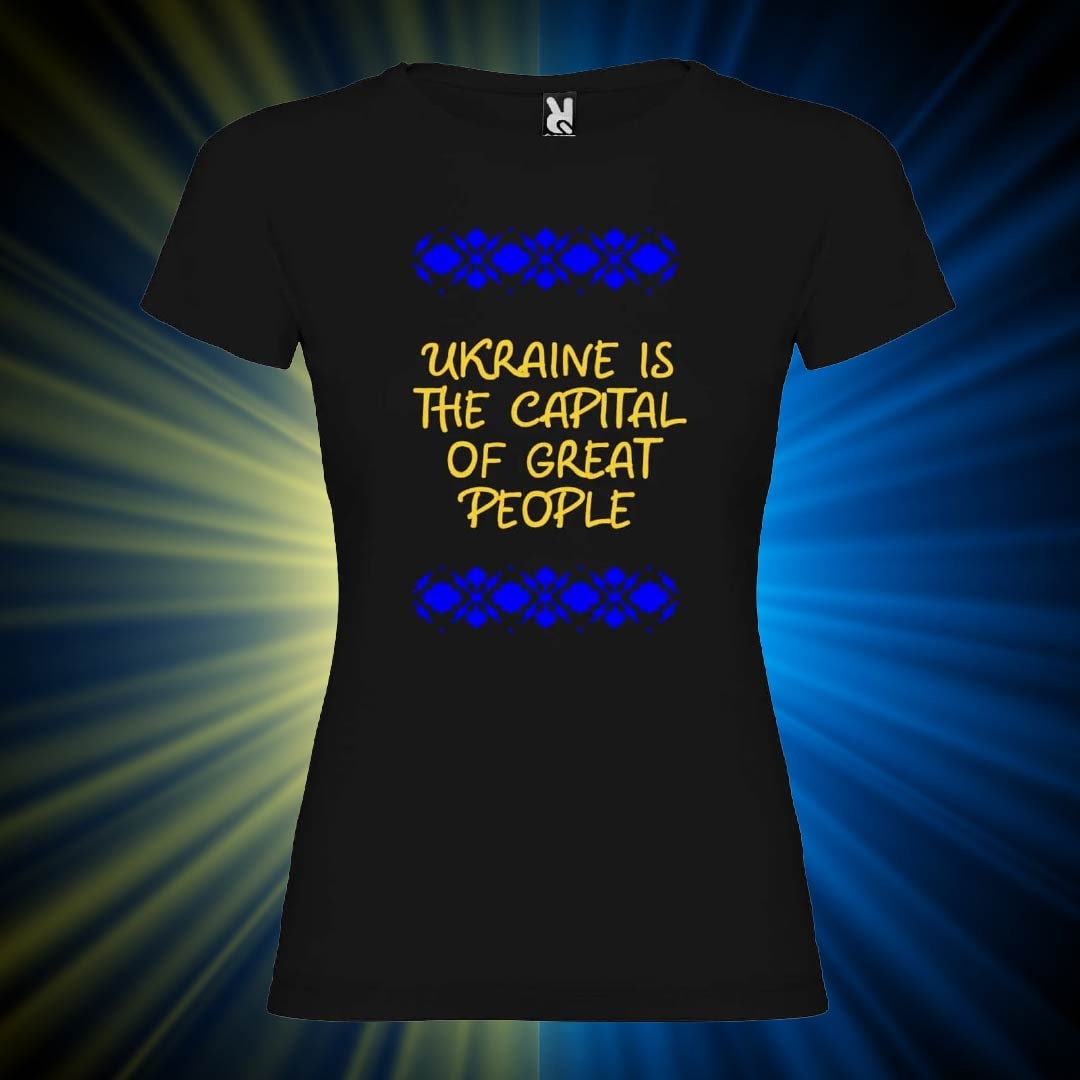 Футболка жіноча Ukraine is the capital of Great People: відчуй силу українського духу! Напис “Ukraine is the capital of Great People” – це більше, ніж просто слова. Це меседж, який об’єднує нас і нагадує про нашу силу та незламність. Якісна бавовна та стильний дизайн зроблять цю футболку твоїм улюбленим елементом гардеробу.