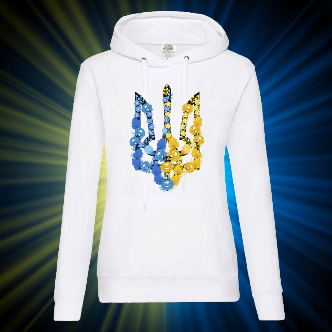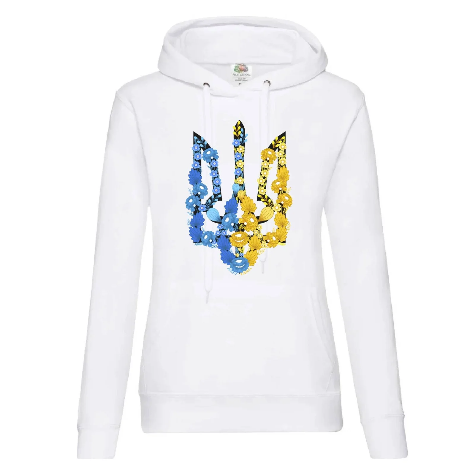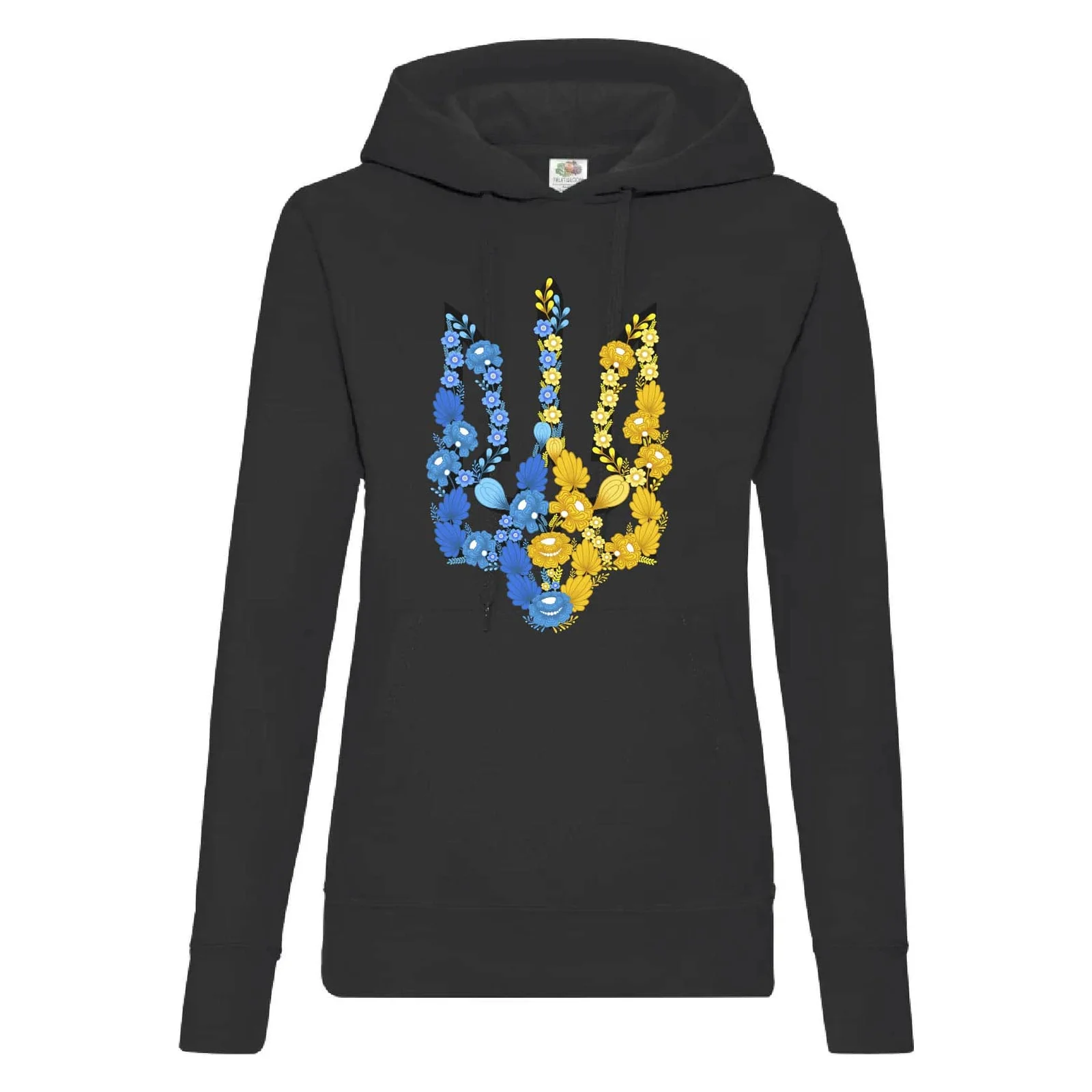 Жіноче худі “Тризуб Квітковий” — ніжна й патріотична класика. Квітковий тризуб, жіночний фасон і комфорт на кожен день.