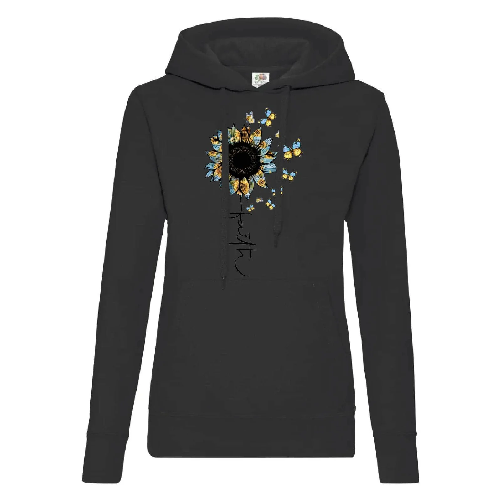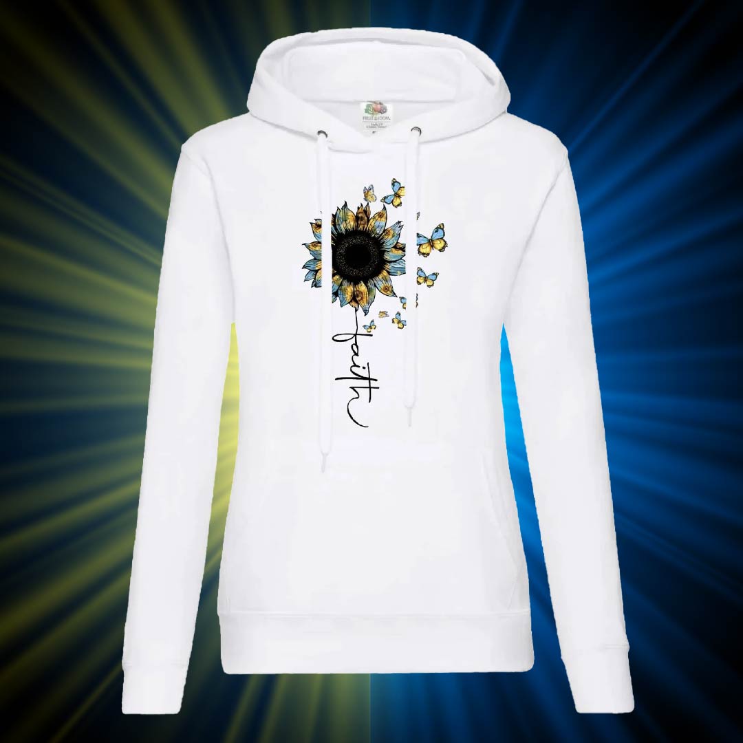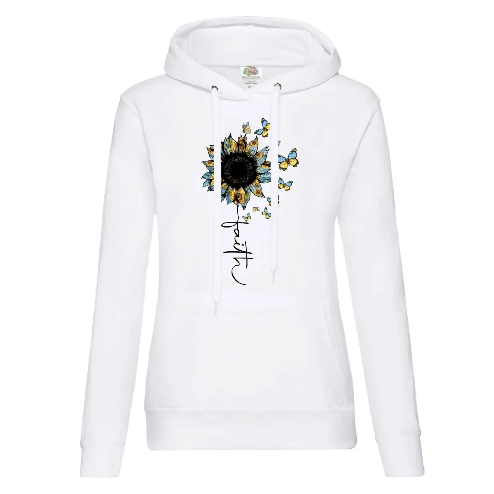 Жіноче худі “Віра незламна” — соняшник, метелики й слово faith у патріотичному стилі. Створене з теплом і змістом.