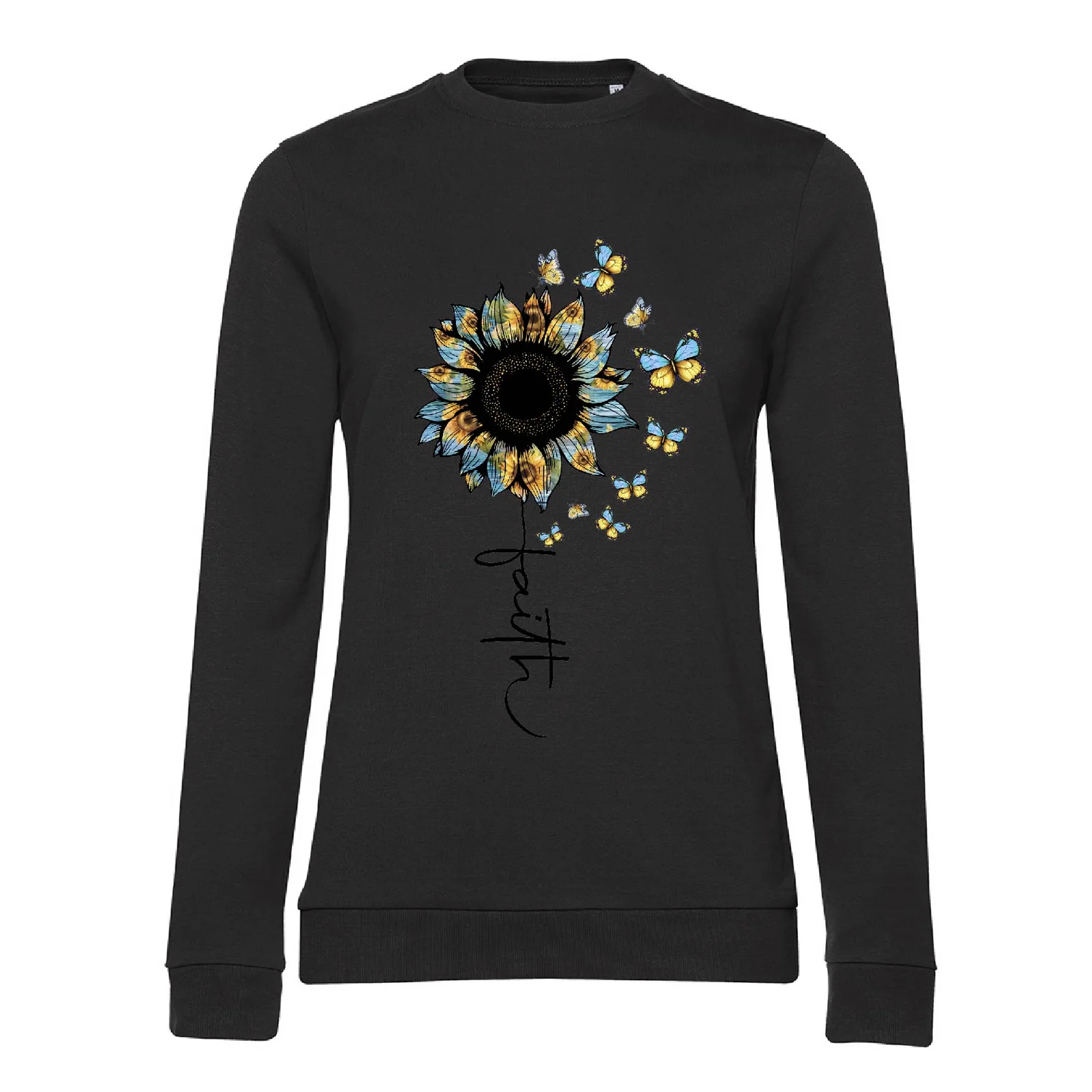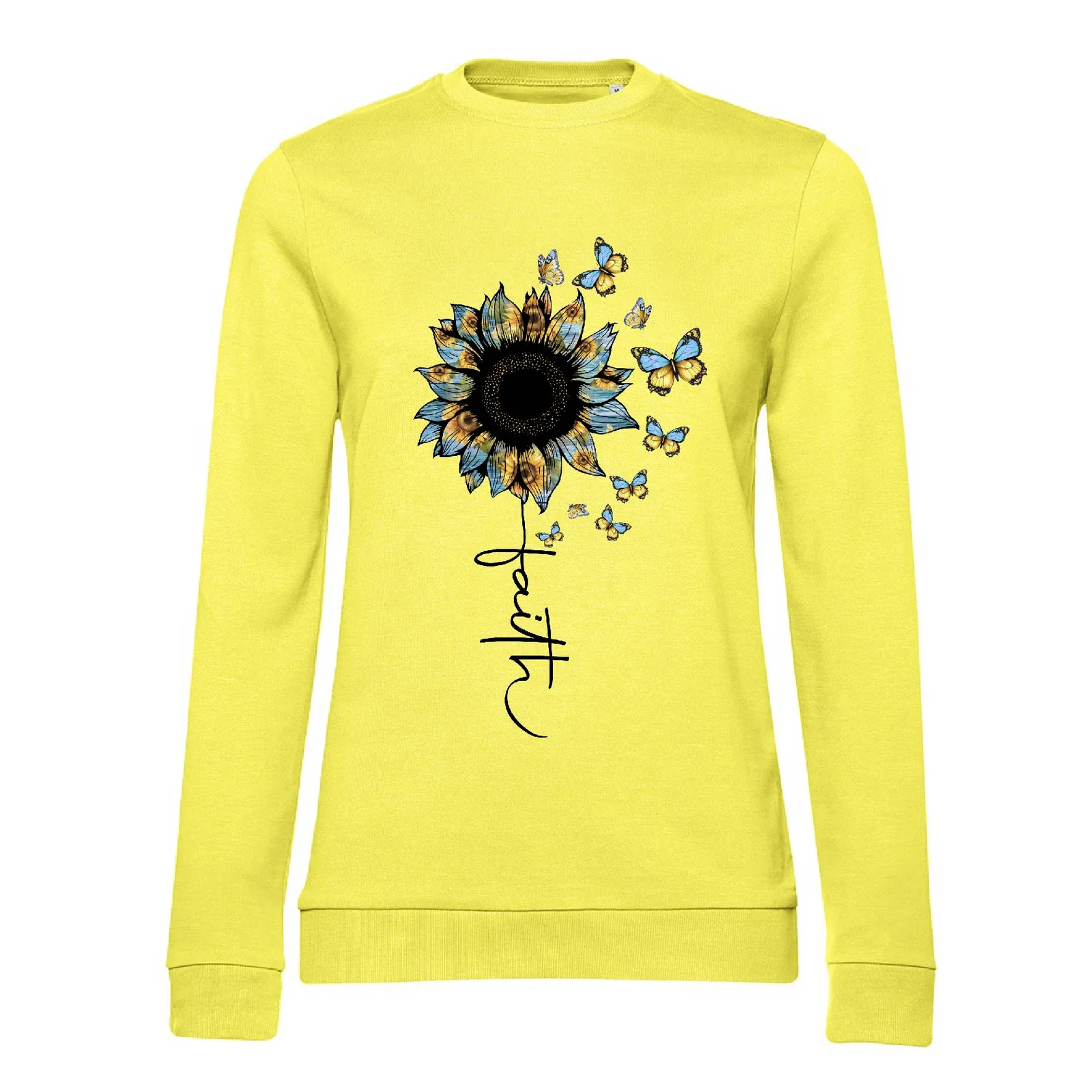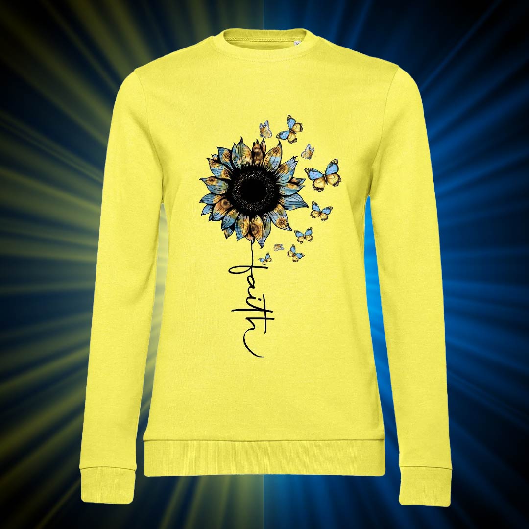 Жіночий світшот “Віра незламна” — ніжний та потужний водночас. Соняшник, метелики й слово faith уособлюють силу, красу й надію.